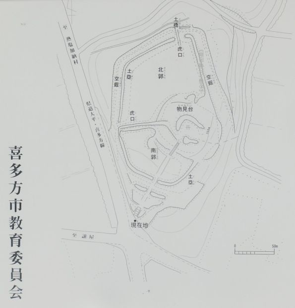 周囲を土塁と空掘で囲む東西160メートル、南北250メートルの大きさ。